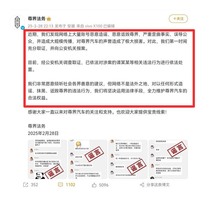 昨天,尊界汽车法务终于出手了,对这些恶意抹黑,造谣的人已经向公安机关报案,而涉事人也被公安机关依法处置!